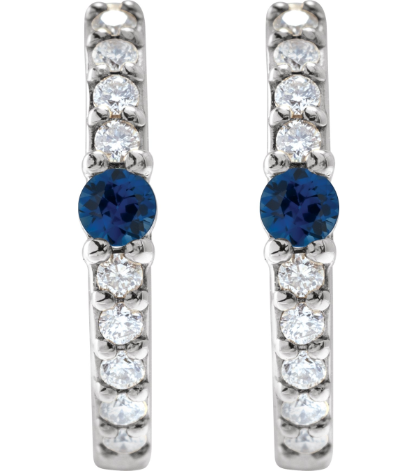 88567 Earring Set 14K White 13.6 Mm 2 Mm Lab-Grown Blue Sapphire Round 2Mm 18 Ctw I1, Gh Pair Hinged Polished Lab-Grown Blue Sapphire And 18 Ctw Natural Diamond Huggie Earrings